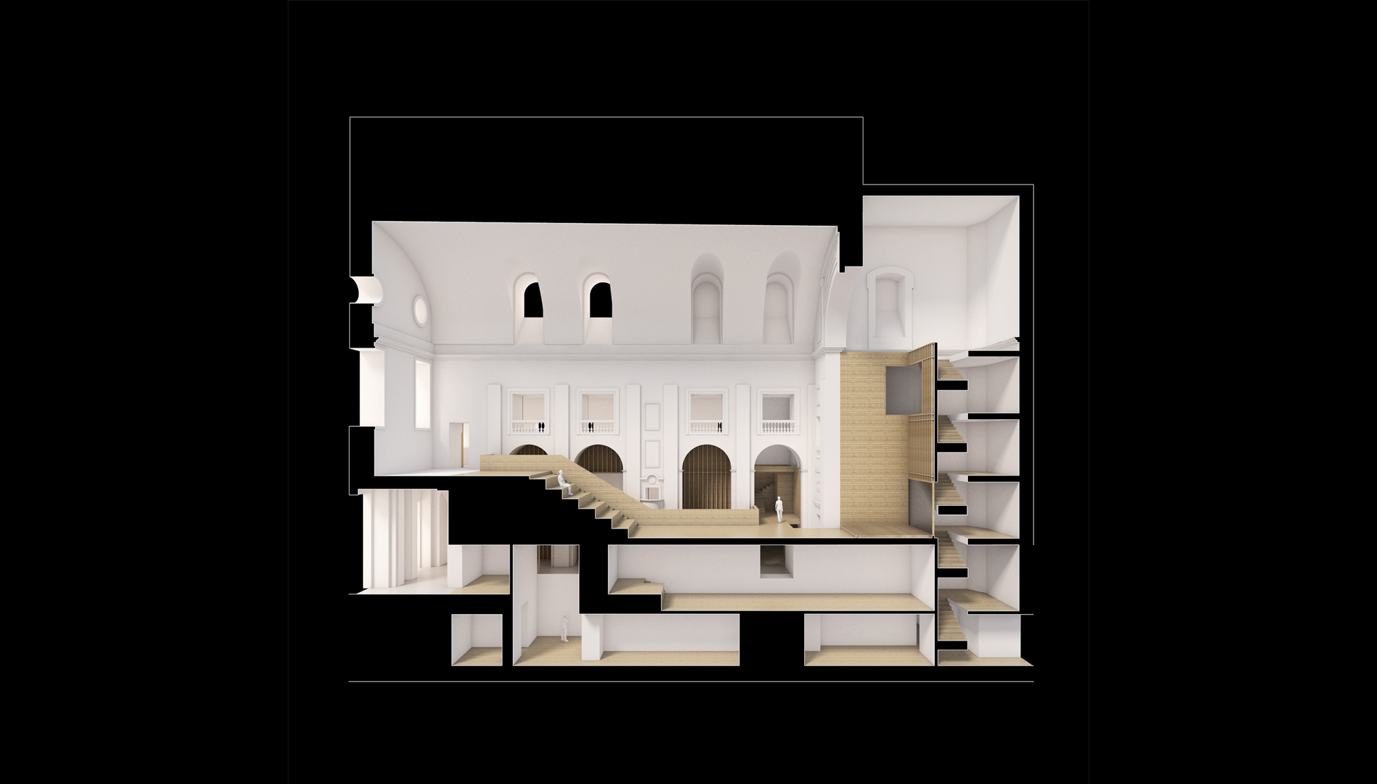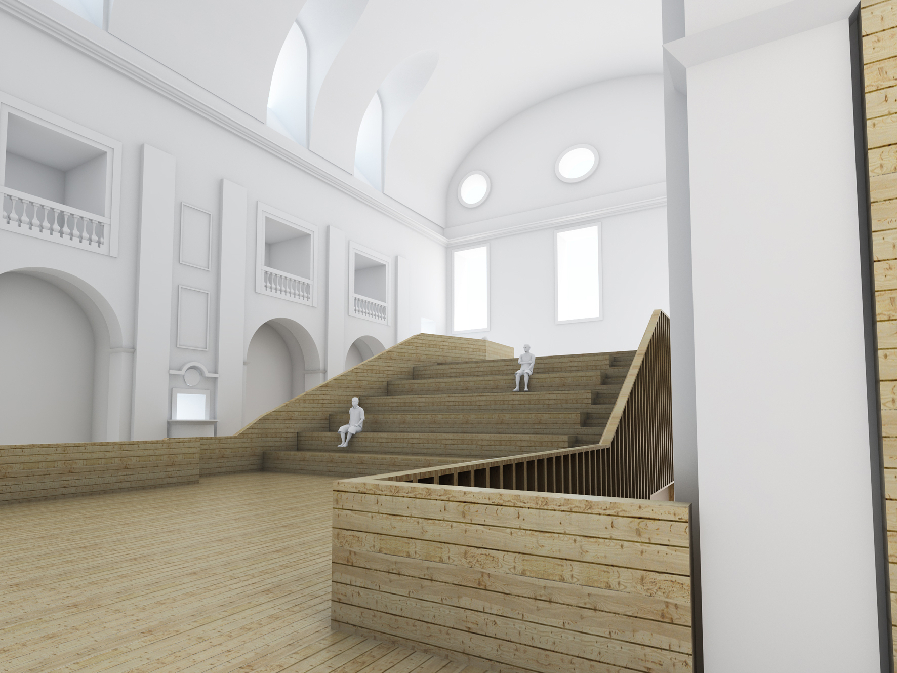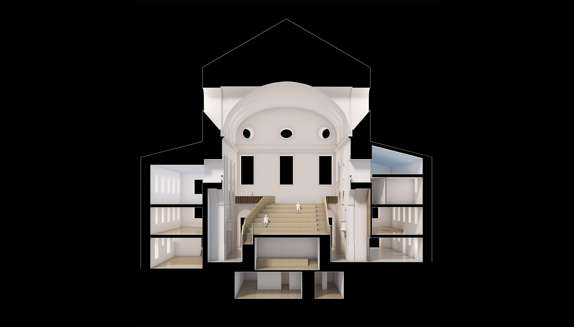 Our solution entails building a new structure containing the auditorium and the multipurpose hall within the central nave. This structure is to be detached from the side walls so as to make it possible to see the nave area as a single whole.